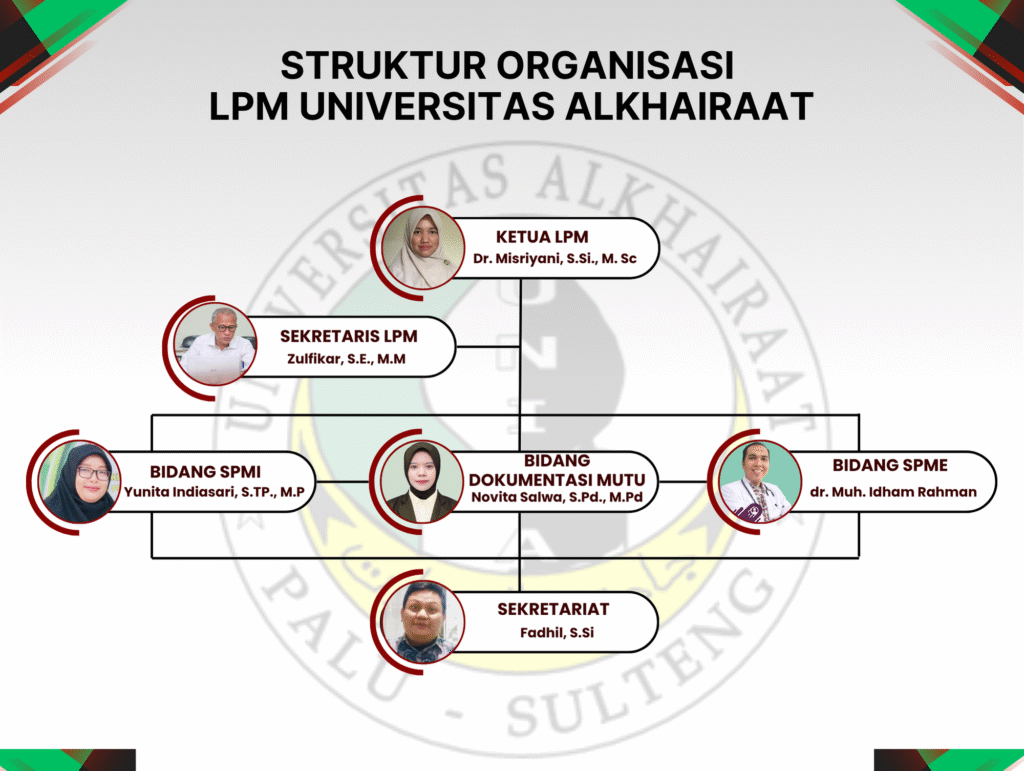 Struktur organisasi Lembaga Penjaminan Mutu (LPM) Universitas Alkhairaat disusun untuk memastikan pelaksanaan penjaminan mutu internal dan eksternal berjalan secara terkoordinasi, efektif, dan berkesinambungan. Setiap unsur dalam struktur ini memiliki tugas dan tanggung jawab yang jelas sesuai bidangnya, dengan berlandaskan pada prinsip profesionalitas, transparansi, dan akuntabilitas.